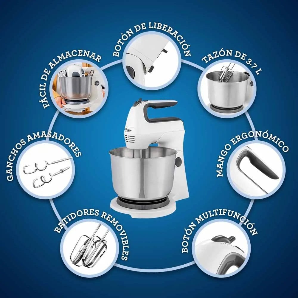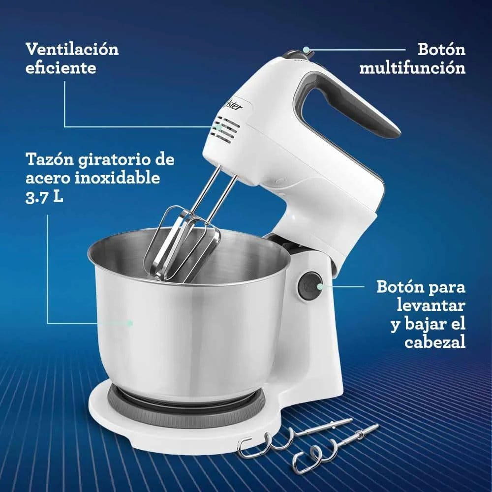 La Batidora de Mano y Pedestal Oster® FPSTHS3612 en elegante color blanco es la herramienta ideal para preparar deliciosas comidas y postres de manera rápida y eficiente. Su acción giratoria única permite mezclar 2 veces más rápido y de manera más uniforme, lo que asegura resultados perfectos en todo tipo de mezclas, desde las gruesas masas de galletas hasta los más delicados merengues. Su diseño ergonómico facilita el manejo, mientras que su mango cómodo ofrece un agarre seguro durante todo el proceso.