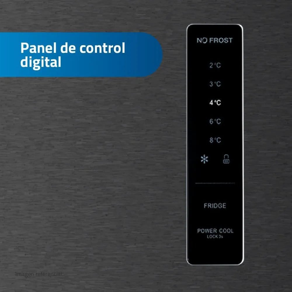 Equipado con un sistema de enfriamiento No Frost, esta refrigeradora evita la acumulación de escarcha, lo que no solo simplifica el mantenimiento, sino que también garantiza que tus alimentos se conserven frescos durante más tiempo. Su panel digital proporciona un control intuitivo y fácil de usar, permitiéndote ajustar la temperatura de manera precisa para adaptarse a tus preferencias y necesidades.
